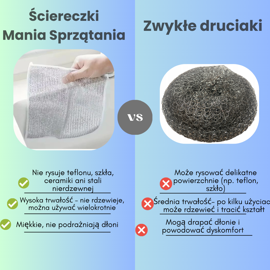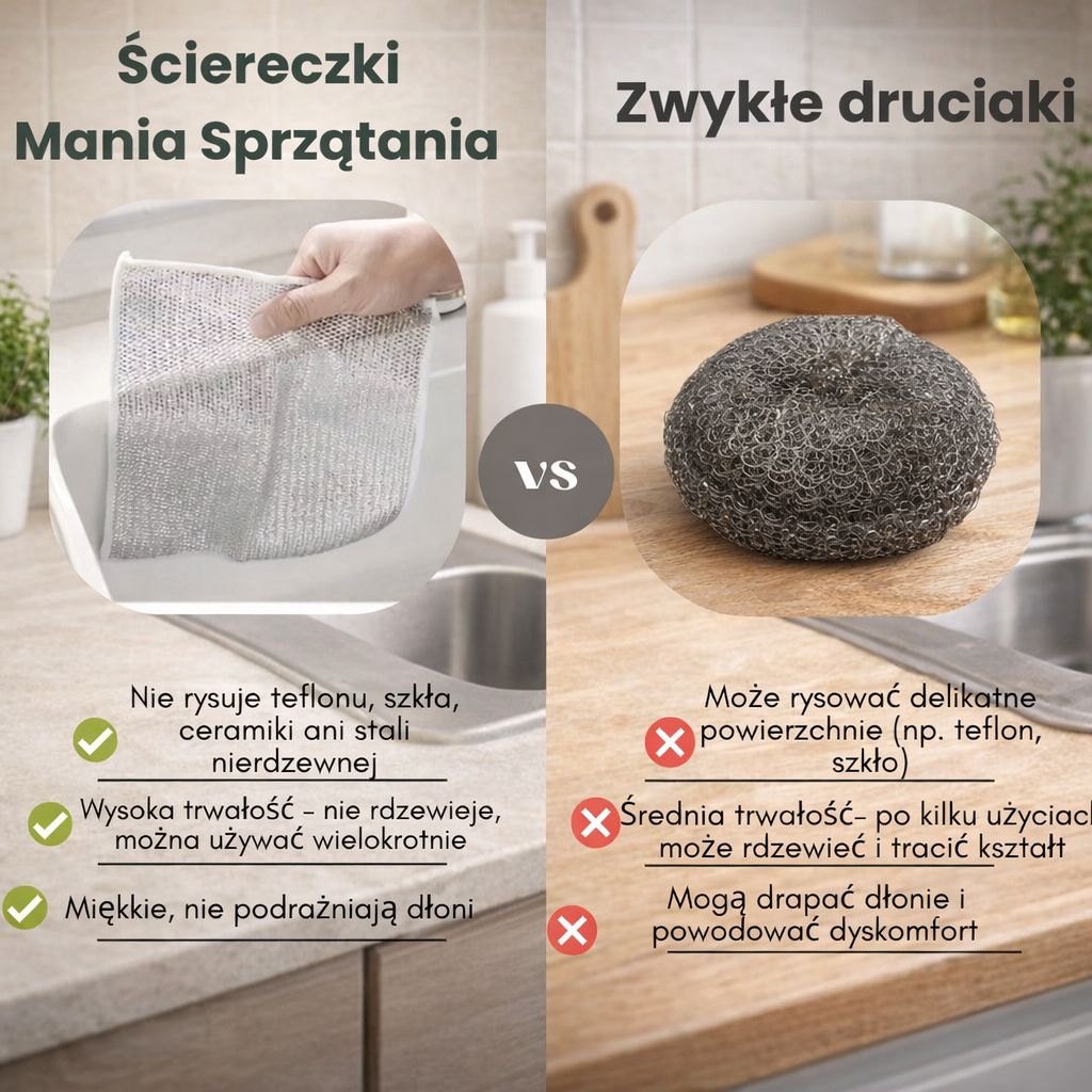 Nie! Włókno ścierne jest skuteczne, ale jednocześnie delikatne. Ściereczka usuwa brud i przypalenia bez zarysowań, dzięki czemu jest bezpieczna dla naczyń, garnków i patelni